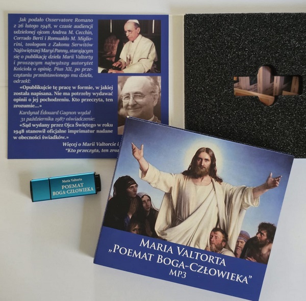 Poemat Boga-Człowieka (komplet) pendrive. Maria Valtorta. Nagranie treści wszystkich Ksiąg "Poematu Boga-Człowieka" w formacie mp3. Tekst czytany przez lektorkę (wyjątek stanowi Księga I; czyta lektor), łącznie ponad 5 tys. stron tekstu wizji i dyktand otrzymanych przez włoską mistyczkę.