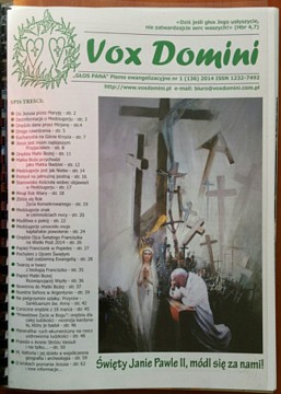 4/2014 W Medziugorju odczuwa się obecność Boga - str. 2; Rodzina jest pierwszą grupą modlitewną - str. 5; Na Festiwalu Młodych doświadczyłem mocy żywego Kościoła - str. 8; Medziugorje jest spojrzeniem w Niebo - str. 11; Rozważania Różańcowe - str. 13; Matka Boża zmienia twoje życie! - str. 14; "Oto Matka twoja" - str. 17 Orędzia Matki Bożej - str. 18; ...pielgrzymować będą, by oddać pokłon... - str. 20; Rozpoczął się Rok Życia Konsekrowanego - str. 22; Akt zawierzenia Matce Bożej losów „Poematu” - str. 28; J. Ottea - Salezjanie w Argentynie - str. 30; Modlitwa do Matki Bożej rozwiązującej węzły - str. 32; Pisma Cataliny Rivas - str. 33; Pewnego dnia wszyscy zwrócą się do Ojca - str. 34; Uczcić Boga Ojca - str. 40; Vassula publikuje dotąd nieujawnione orędzia (3) - str. 42; Spotkanie z Ojcem Świętym i jubileuszowy prezent - str. 47; Turcja: Niech Duch Św. uczyni nas świadkami Ewangelii - str. 48; "Bóg nie może nie słyszeć głosu swego Syna Jezusa" - str. 57; Błogosławieństwa (1) Błogosławieni ubodzy - str. 58; Płaszcz świętego Józefa - str. 60.