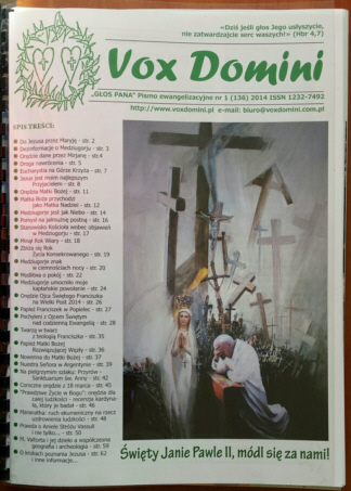 1/2014. Do Jezusa przez Maryję - str. 2; Dezinformacje o Medziugorju - str. 3; Orędzie dane przez Mirjanę - str.4; Droga nawrócenia - str. 5; Eucharystia na Górze Krzyża - str. 7; Jezus jest moim najlepszym Przyjacielem - str. 8; Orędzia Matki Bożej - str. 11; Matka Boża przychodzi jako Matka Nadziei - str. 12; Medziugorje jest jak Niebo - str. 14; Pomysł na jałmużnę postną - str. 16; Stanowisko Kościoła wobec objawień w Medziugorju - str. 17; Minął Rok Wiary - str. 18; Zbliża się Rok Życia Konsekrowanego - str. 19; Medziugorje znak w ciemnościach nocy - str. 20; Modlitwa o pokój - str. 22; Medziugorje umocniło moje kapłańskie powołanie - str. 24; Orędzie Ojca Świętego Franciszka na Wielki Post 2014 - str. 26; Papież Franciszek w Popielec - str. 27; Pochyleni z Ojcem Świętym nad codzienną Ewangelią - str. 28; Twarzą w twarz z teologią Franciszka - str. 35; Papież Matki Bożej Rozwiązującej Węzły - str. 36; Nowenna do Matki Bożej rozwiązującej węzły - str. 37; Nuestra SeĂąora w Argentynie - str. 39; Na pielgrzymim szlaku: Przyrów - Sanktuarium św. Anny - str. 42; Coroczne orędzie z 18 marca - str. 45; "Prawdziwe Życie w Bogu": orędzia dla całej ludzkości - recenzja kardynała, który je badał - str. 46; Maranatha: ruch ekumeniczny na rzecz uzdrowienia ludzkości - str. 48; Prawda o Aniele Stróżu Vassuli i nie tylko... odpowiedź na artykuł p. Grzegorza Felsa - str. 50; M. Valtorta i jej dzieło a współczesna geografia i archeologia - str. 59; O krokach poznania Jezusa - str. 62;